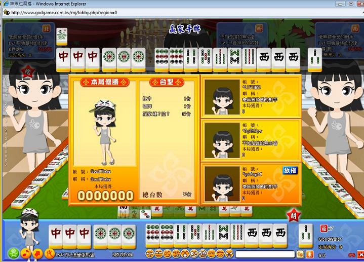 昨天晚上小玩一下,還不到一圈就把錢輸光,只好玩不用點數的沒想到,牌運馬上番紅,超旺的...在當莊之前就已經連胡了很多把,當了莊更是旺到不行!